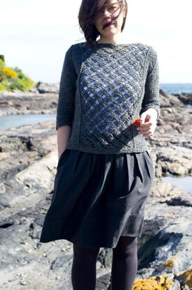 Made with Rowan Felted Tweed, Eventide is lightweight, which helps to highlight the lace panel in front and back, and also works well with the tweedy stitch of the sides and sleeves. This raglan-style sweater is worked in four pieces and then seamed. This would be a good piece for an advanced beginner or intermediate project.