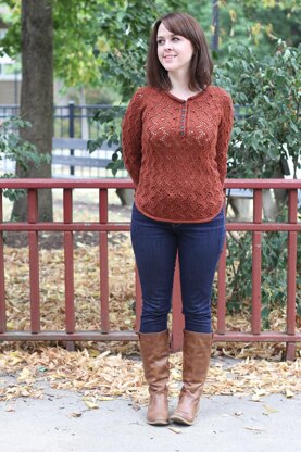 Like most girls I know, I wear flip-flops before it's warm enough and sweaters before it's cold enough, because I'm always antsy for the next season to start, even though we're not done with the current one. The Everett Henley is great for those not-quite-cold-enough-for-a-sweater-days if you layer it over a camisole, but it can easily take you into actual winter if you layer it over a button down and add some killer boots. The lace pattern is one of my all-time favorites, and top-down construction means that it's totally seamless. The curved hem, applied i-cord bind-off, and three-quarter sleeves add structural interest and detail.