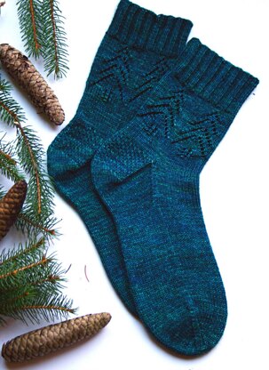 Created from a desire for a quick & easy pine tree sock pattern, Evergreen Socks are a perfect project to curl up with during the chilly winter season. This pattern is great for beginning lace knitters and/or beginning sock knitters as the lace pattern is very intuitive and knits up quickly.