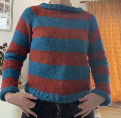 This jumper is worked top down in the round with raglan increases. It features a two colour stripe pattern down the body and sleeves. All the ribs are turned in on themselves for double thickness and rounded finished edge.