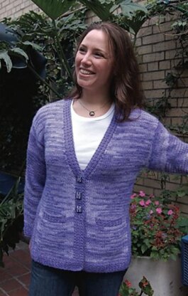 This comfortable jacket with side slits, is knitted in one piece with shoulder seams - pockets are optional. It may be worked in multi yarn with solid trim, as shown, or in one color. Sleeves are worked in rounds from shoulder to cuff. This is an easy project to make without pockets, with pockets the skill level is intermediate.