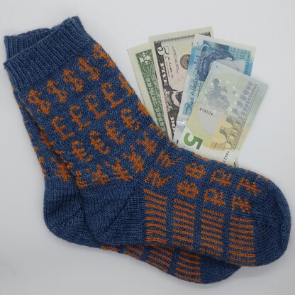 Perfect for travellers, but also great for accountants and financiers, colourwork currency symbols are worked on the leg and upper foot of these socks.