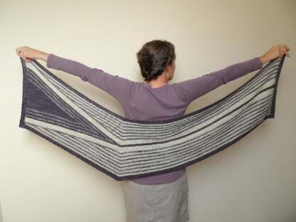Three colors of fingering weight yarn are used to create a bent rectangular wrap full of stripes and angles. The slight bend makes it curve nicely around your shoulders. It's not nearly as complicated to make as it looks - just one color at a time and some short rows and decreases here and there. Instructions are given line-by-line and can simply be checked off as you go.