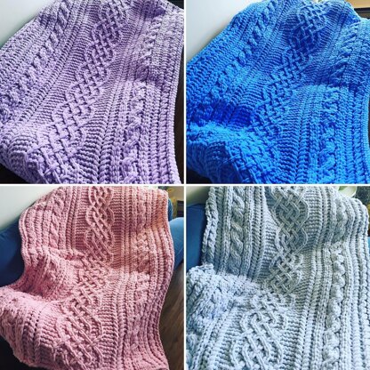 THIS IS A LOOP YARN FINGER-KNITTING PATTERN. The Extra-Long Celtic Cable Saxon Braid Blanket is a mixed pattern of cables of different sizes with a centre pattern of a repeating Saxon braid. The Saxon braid is a common feature and centrepiece of Irish knitting. This pattern is a re-interpretation of my Chunky Celtic Cable Saxon Braid Blanket pattern in a larger size. (UK KNITTERS CAN SUBSTITUTE 8 SKEINS OF BERNAT ALIZE BLANKET-EZ YARN.)