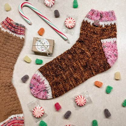 Originally designed as a fingering weight sock pattern, the Iced Gingerbread Socks are now EXTRA THICK with a DK weight sock pattern. They feature a simple and meditative stitch pattern that is perfect for cozy holiday nights by the fire or a festive movie. A thoughtfully crafted slip-stitch pattern produces the perfect icing drip transition between the candy-inspired contrasting cuff, heel, and toes. An Eye of Partridge heel produces a texture that allows your contrasting yarn to pop in a unique and unexpected way.