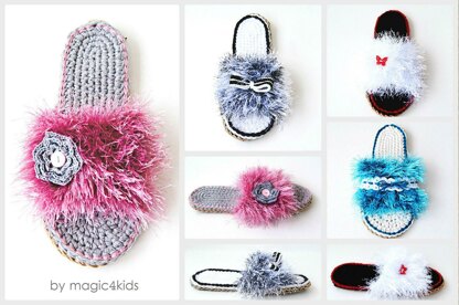 The eyelash yarn is funny and feminine! You can make these slippers is any color and you can decorate it in many ways.