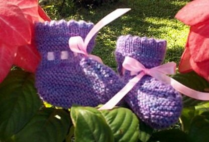 Sweet little garter stitch booties with just a touch of eyelet lace are fast to knit up to match many lace bonnets and sweaters. Bootie is worked in one piece both flat and in the round.