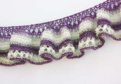 A flutter of ruffles for your neck. The ruffles are knit in a pretty lace eyelet pattern. You can wear the scarf in many ways: knotted and tucked into your coat for a froth at your throat or allowed to float down your coat. The scarf is also long enough to double and tie with a knot at the neck. Or you can wrap it round and round for a ruffled cowl effect. Wear it tight around your neck for warmth in winter or as a pretty fashion accessory in spring and fall. The scarf is not difficult and is appropriate for everyone with basic knitting skills.