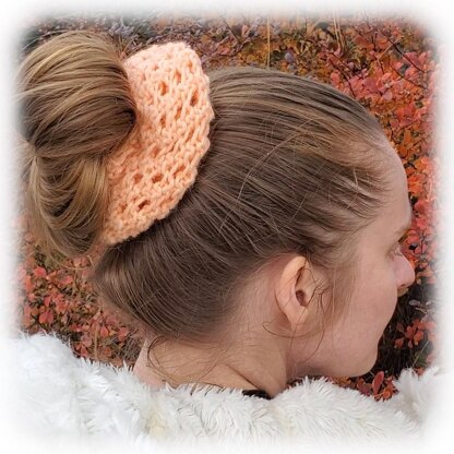 Eyelet Stitch Scrunchie Hair Tie Have fun with your hair this holiday season and knit this fun scrunchie knitting pattern. Knitted in the round with a simple knitting stitch pattern that has a 4-row repeat, this knit scrunchie pattern is a perfect knitting pattern for a beginner. The Eyelet Stitch is a lace stitch knitting pattern and can be used in other projects. Each of the knitting techniques used have accompanying YouTube tutorial videos.