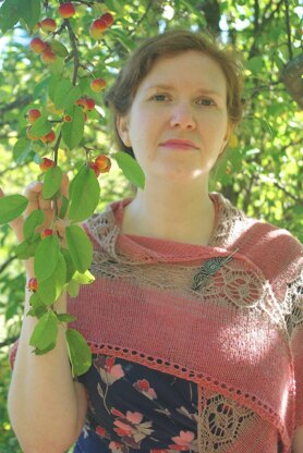Every so often, a design bursts, Athena-like, fully formed from its creator’s head. Ezekiel Saw is one such design for me. I had a clear vision of a triangle shawl in two-similarly toned, but distinct colors with detailed open lace bands. The subtly marled palette of CoopKnits’ Socks Yeah! provided the perfect material for bringing that vision to life.