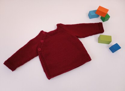 When my grandsons was born I made them a similar jumper but it was knit top down and only came in a newborn size. I've been asked so many times for a design like this by my customers but knit flat on 2 needles and in larger sizes too. It's a unisex design that wraps over completely at the front so very cosy for a little one. I use mismatched buttons on the grey version and matching on the red one so the choice is yours.