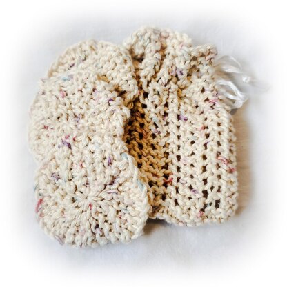 Have fun with your face skin care routine with these homemade face scrubs. You can gently exfoliate with these easy to knit Face Scrubs. This knitting pattern is for beginners with an alternate knitting pattern for those looking to practice German Short Rows. You can easily knit all the face scrubs with in a day making it perfect for a quick knitting project. You can also make a knitting bag to carry them, the pattern listed features a simple lace design pattern. Everything is knitted with a pair of straight knitting needles. Finished size is 4x6 in.