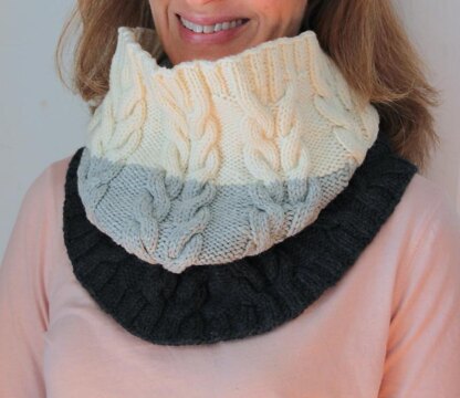 A cozy, color block cowl with cables.