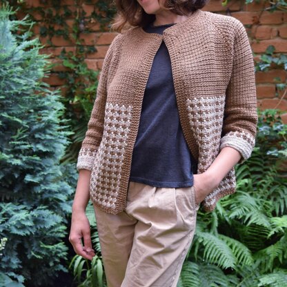 Fade to Light Jacket is designed to fit with 4-6 inches (10-15 cm) of positive ease at the bust and 1.25-2 in (3-5 cm) of positive ease at the upper arm. The jacket is worked seamlessly from top down. First some short rows are worked back and forth to raise the back neck. Then the yoke with raglan increases is worked in rows to separation for body and sleeves. The lower body with mosaic pattern is worked in rows to bottom. Sleeves are worked top down. The length of the body and sleeves is easily adjustable.