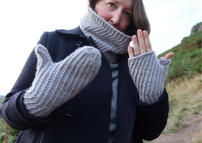 The cowl and mittens are worked in a spiral after the starting chain is joined.
