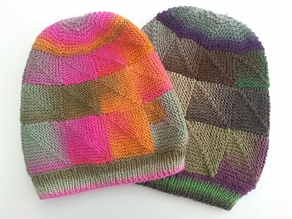 This hat pattern uses self striping yarn and modular knitting to achieve a unique patchwork effect. It is fun and easy to do and comes in three sizes. To fit head circumference of approx. 48-51 cm or 19- 20 " (CHILD), 52-56 cm or 20 1/2-22" (WOMEN'S) and 57-60 cm or 22 1/2- 23 5/8" (MEN'S) The hat is worked from the bottom up and can be worked flat or partially in the round for ribbing and crown, it's up to you. Instructions for both are included. Materials: Up to 100 g of DK (8 ply) yarn, which is self-striping. Yarn Suggestion: King Cole Riot DK Knitting needles size 3 mm (US 3) and 4 mm (US 6) I suggest a 40 cm (16") circular in both sizes and also 2 DPN's in the larger size.