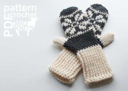 Keep your hands (or someone else's) warm this winter with these extra thick and cozy crocheted mittens! This do-it-yourself pattern includes instructions to create the Ladies Large / Mens Small (8” from wrist to fingertip; 8” hand circumference; 5” cuff) pair of mittens. Crocheted using a split single crochet stitch (ssc), the smooth v's of the textile are reminiscent of a smooth knit stockinette stitch. These written instructions include color work charts and photos for pattern clarification making it an easy to follow how-to.