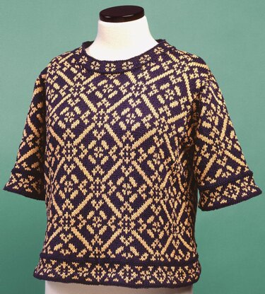 I was playing with different elements of Fair Isle designs when I came up with the pattern used in this sweater. I thought it was a perfect match for the royal colors of purple and gold. The band patterns are all taken from the larger pattern, and the bands are all hemmed for a nice finish. The purl ridges set the patterns off from one another.