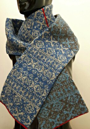 This 6.5x72 inches (16.5x183cm) scarf is knit in the round, meaning that it is reversible and doubly thick as well. The ends are closed using a 3-needle bind-off technique.