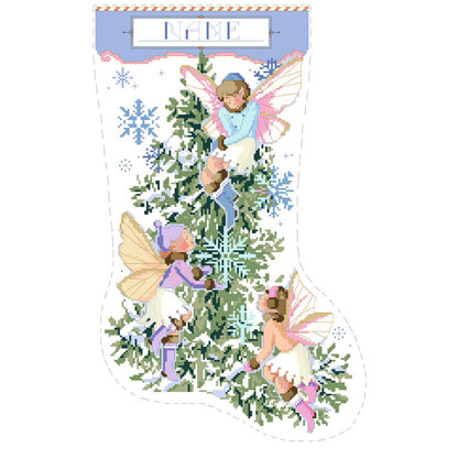 By Sandy Orton. Such a sweet and unexpected Christmas stocking design. Pastels, snowflakes and three vintage style fairies flit about the lovely fir tree. A great heirloom piece for that perfect little girl.
