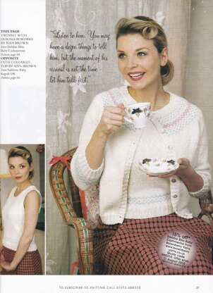 This is a pattern for a Fairisle Border Twinset, originally published in Knitting magazine s WI issue. The top is a sleeveless top with rib edges, and a fairisle border. The cardigan has raglan sleeves, rib edges and a fairisle yoke and cuff. Photo Laurel Guilfoyle for Knitting magazine.