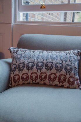This rectangular cushion is knitted in stocking stitch in Rowan Felted Tweed DK. The front features rows of contrasting sheep motifs in 5 colours. The buttoned back is knitted in stripes from the same colourways.