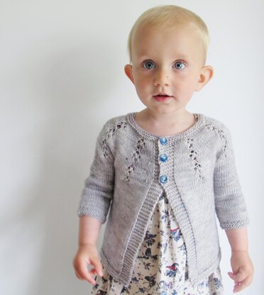 This sweet cardigan is worked seamlessly from the top down. The yoke is shaped with yarn over increases, then the body and sleeves are separated. The body is worked back and forth; the sleeves are worked in stockinette stitch in the round. The hems and cuffs are finished with garter stitch. It’s a good idea to read the pattern thoroughly before you begin.