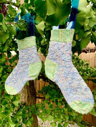 Our brain is receptive to fake news. This easy pattern I used for socks consisting of crossed stitches creates this illusionary effect. Our brain connects the crossings making the pattern seem like an elaborate diamond design on the knitted background.I used some leftovers I had of this summery Mouliné cotton in beautiful pastel colours to knit these socks in the illusion-pattern. Even though the thick yarn might not be ideal for socks and the finished socks are thicker than usual, that is exactly what makes them ideal for summer evenings on cold floors.