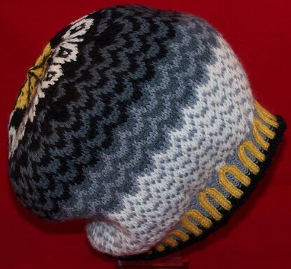 This black, white and gray hat is designed to look like the feathers on a Peregrine Falcon, from the talons on the brim to the beaks on the crown. Pattern calls for 16" circular needles in sizes 2 and 3, plus double-point needles to close up the top. Kits and yarn packs are available with 100% wool yarn sufficient to knit this sophisticated yet whimsical design. Finished hat is lightweight enough to wear from fall through spring.
