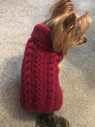 This Fall Cabled Dog Sweater is knitted in two pieces from bottom-up that are stitched together. The sweater will stretch to fit 'in-between' sizes. For dogs who are smaller than size 15" chest, or for dogs who are larger than size 19" chest, adjustment to the sweater can be made to obtain size 13" or 21" chest.