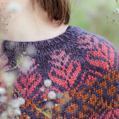 This sweater is worked from the top-down, featuring a yoke worked in stranded colorwork with four colors (though only two per row!), colorful specks adorning the body and sleeves, and a straight shape for cozy comfort. It is worked in DK weight yarn and is available in 10 sizes.