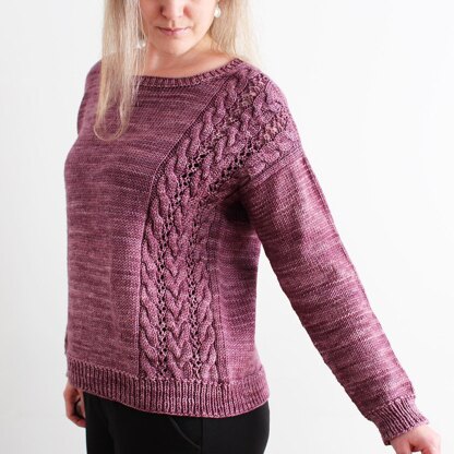 This beautiful sweater features an eye-catching panel with a cable & lace motif that elegantly runs down the left shoulder and side of the body. It was inspired by my beloved Fallen Cloud shawl design.