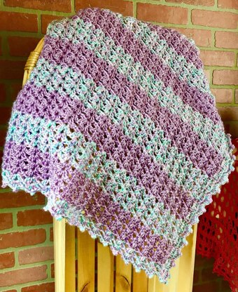 Here's another easy beginner blanket by Bonnie that is an easy repeat that yields a lovely lace-like fabric! You can make this as long or as short as you would like.