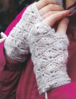This is a pattern for Fantail Crochet Gloves, originally published in Inside Crochet. They are in a fantail lace stitch with a thumb and straight across the top. there is a tie and eyelets at the wrist. Photos Inside Crochet.