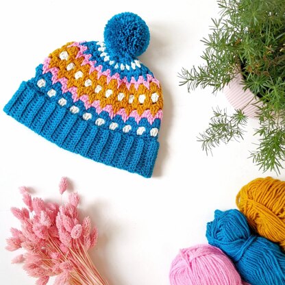 The Faraway hat is a fun colourful bobble hat which can be made in just two evenings using your DK yarn stash.