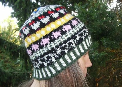 Inspired by the farm in the "Rosenheim Cops" this beanie came into existence. I had always liked to make up a blanket or sweater with a complete farm on it. Never dreamt about getting this on a beanie. But I did it! I chose the most traditional animals that you can find on a farm as the place on a beanie is somehow limited ;-) It has a corrugated two color ribbing in green and off-white, a row of cows (Brunhilde, Resi & Co), little fences, cute little pigs, an egg-peerie pattern and hens and at the top is the half-timbered farm house and the sun is shining on top of it. For smaller heads it will be a bit of a long beanie. For bigger heads more sort of a normal beanie.