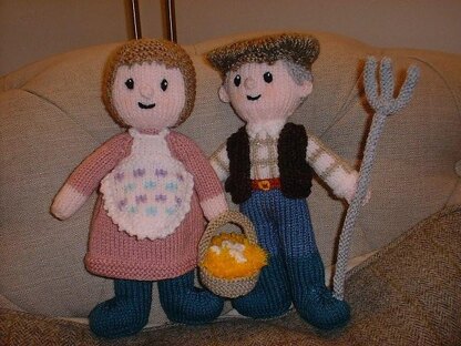 Lots of little details such as the pitchfork, welly boots and basket make this pair irresistible! The checked shirt on the farmer has tiny buttons, his cap has a tweed look and his gilet has is knitted in a diamond pattern. His wife wears a polka dot apron and her basket is filled with freshly collected eggs!
