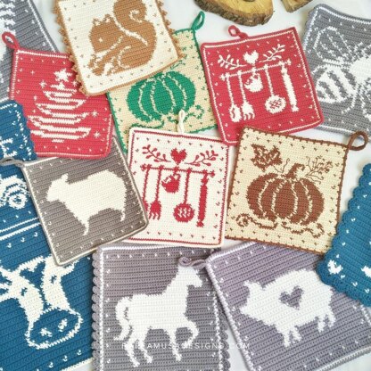 The Farmhouse Collection of tapestry crochet potholders includes 14 designs.