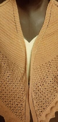 Lacy faroese shawl worked with different stitch patterns, including stockinette, seed stitch, chevron, lace