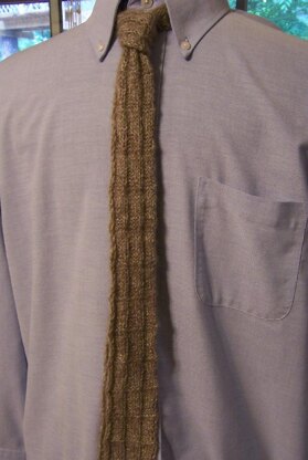The ties is a knit-purl texture stitch that adds interest while also ensuring that the tie lies flat. The tie is 2.5" wide at the straight hem ... narrowing to 1.5" for the around the neck portion and the under part. The fingering weight cashmere is held double throughout to give body to the tie.