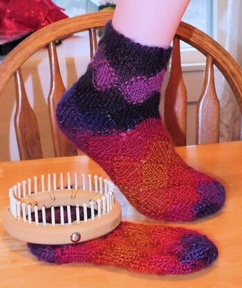 This is a little bit of a challenge but I think well worth the effort. The entire sock is done in diamonds, this includes the heel and the toe. I have a written for the 36 peg 1/4" gauge loom and a full video tutorial for the 40 peg 3/8" gauge loom. I explain if you want to use different looms to adjust the sizing. The 36 peg is for baby to toddler, and if you use the 36 3/8" gauge you can get child, and if you use the 40 you can get adult. I used 1 1/2 skeins of Lions Brand Landscape Volcano yarn. This included lining up the colors. I would suggest this style or Red Heart Boutique Unforgettable for yarns with just the right about of time between color changes. Not too fast and not too quick. I love the effect and the challenge of making it all in diamonds. I would suggest stitch markers for this project.