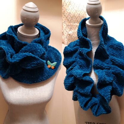 The crocheted peacock faux fur cowl looks amazing worn loosely or doubled. It has elastic woven through the the center to create a scrunchy effect. It is crocheted in the round with a soft chenille, bulky yarn that is a dream to work with. Premier Parfait yarn is available in a big ball (574 yards). It is quick and easy to make. Skill Level: Easy