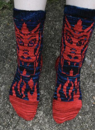 Two fearsome dragons guard these spectacular socks. Worked from the top down with a flap and gusset heel, these socks are a treat for fans of stranded colourwork. Some experience of the stranded technique will definitely be an advantage, as the heel section involves working flat (back and forth in rows).