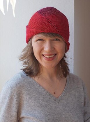 It can be adjusted to fit any head size during the knitting and works with any yarn you have in your stash – gauge does not matter! To make the unusual construction visible, a gradient yarn that is not too thin works best. The knitting is very relaxed garter stitch, just back and forth with a few decreases and increases, so it is suitable for a wide range of knitting skills, including ambitious beginners with a taste for the unusual.