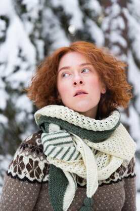 An easy-to-memorize lace pattern in one color and intarsia stripes in two colors play off of each other on two sides of the central spine. The arrow shape is completed with a garter-stitch triangle made in the accent color. A tassel is added to each corner of the shawl.