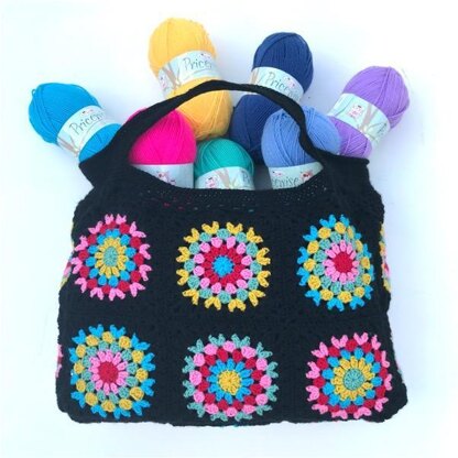 The bag is constructed using sunburst granny squares. The detailed pattern includes instructions for the granny squares, assembly, optional lining and crochet handles. There are also instructions for adding the rope and bamboo handles so you can choose which handles you would like – crochet, rope or bamboo!!