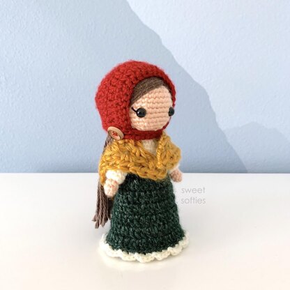 Felicity the Forest Maiden features a lovely, folktale-inspired doll. She wears a long, bell-shaped dress that allows her to stand upright on her own. She also dons a cozy shawl and a red bonnet, both accessories being removable as a fun play feature. Any young child who loves playing dress-up and the whimsical charm of medieval stories will adore Felicity! This crochet doll pattern is suitable for intermediate crocheters. It requires the basic amigurumi stitches and involves shaping with increases and decreases for the body parts. It also involves skills such as sewing parts together, changing colors, and attaching yarn. The PDF pattern file includes instructions to guide you through the entire doll-making process for Felicity, her clothing, and her accessories. It also includes numerous photo references and a hair tutorial.