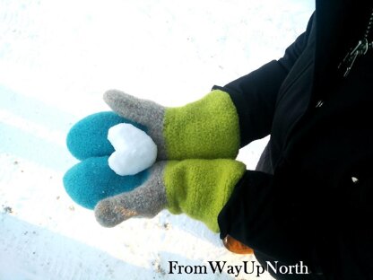 This is the 2nd pattern for felted mitts I've made, and my favourite! As with all my felted patterns, they are designed to be easy to make and allow the laundry machine do all the hard work!! You will find these mitts plenty warm enough and the long cuff keeps the snow and cold out. I picked an easy to find worsted wool brand for the wide variety of colour choices so have fun picking out your colours. If you've never felted before, you will probably get hooked! It's amazing to see your pieces transform in the washing machine as they shrink and the fibers intertwine. Plus, the warmth of the wool is perfect for these cold winters! They are great to make for gifts as well... trust me once people see them, requests will soon follow. I've included sizes for Adult small, medium, and large.