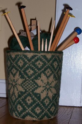 This felted fair-isle basket will brighten your home while also being a very useful basket to keep your project, yarn or needles in. Sized to fit a standard round powder-room wastebasket (approx. 25" diameter and 9" height), this fun project is a wonderful project for newbie color-work knitters. You need 200 yards of two colors. [The sample used KP's Wool of the Andes]