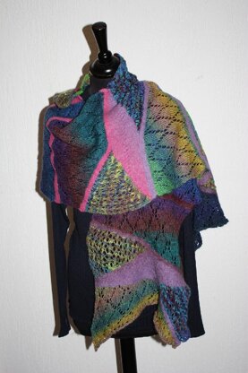 Ich wollte Sockenwolle, die in unendlich vielen Muster- und Farbvarianten angeboten wird und durch Superwash-Ausrüstung nicht filzbar gemacht wurde, mit verfilzbarer Wolle kombinieren. Das asymmetrische Mosaik-Muster mit den Trennlinien aus filzender Wolle wird nach dem Waschen noch in seiner Form verändert. Ein besonderer Reiz entsteht durch die unterschiedlich dichten Gestrick-Oberflächen.